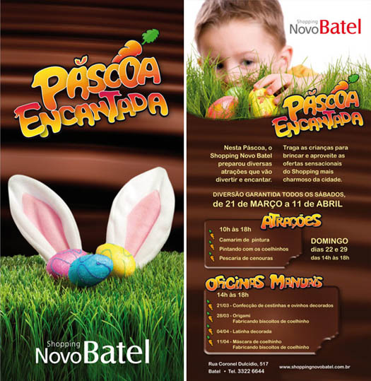 O Shopping Novo Batel iniciou no sábado, 21 de março, sua programação de Páscoa, com diversas atrações voltadas ao público infantil. O evento “Páscoa Encantada Novo Batel” oferece atividades e oficinas manuais com pintura com coelhos, pescaria de cenoura, confecção de cestinhas, latas e ovos decorados, origami e produção de máscaras e biscoitos de coelhos. A Primapress Design Gráfico criou folhetos e cartazes para divulgar o evento, que vai até o dia 11 de abril. (Matéria publicada no Clickmarket)